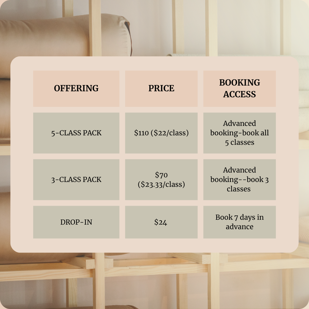 Pass Validity: All class passes (Drop‑In and Series Packs) are valid only for the current Series. Unused classes do not carry forward to future sessions.